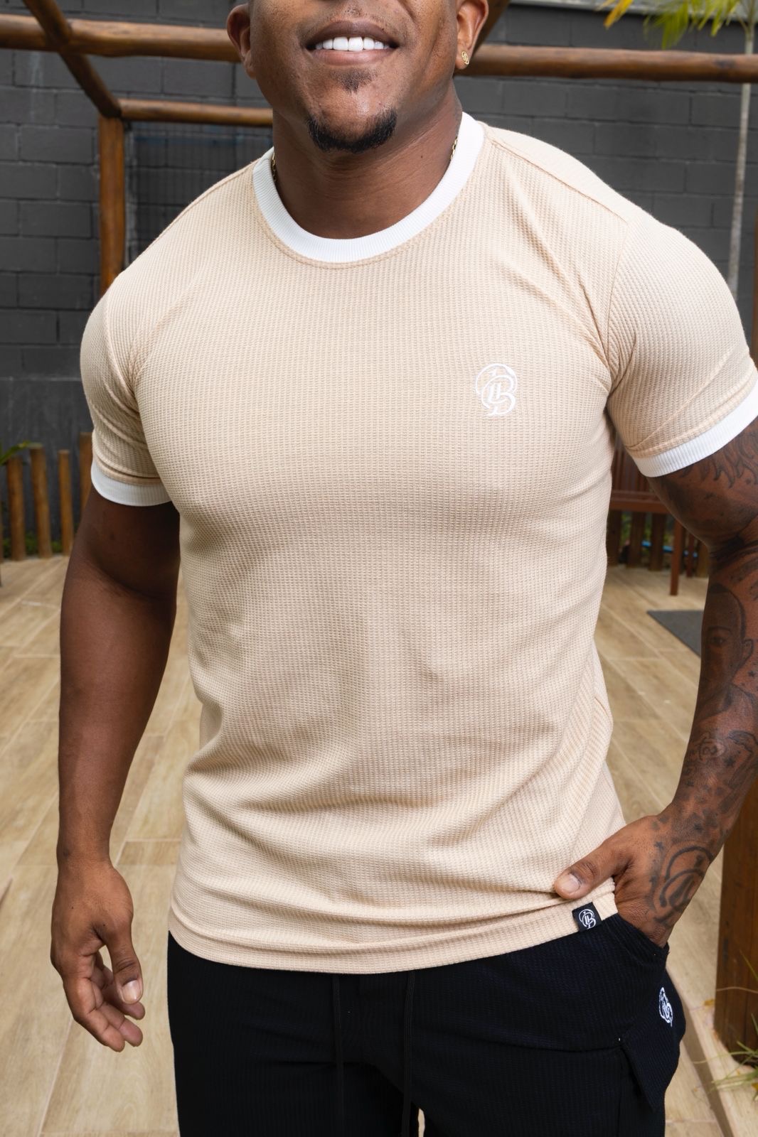 Camisa Bege Tricot Gola e Punho Off-White De Buenas