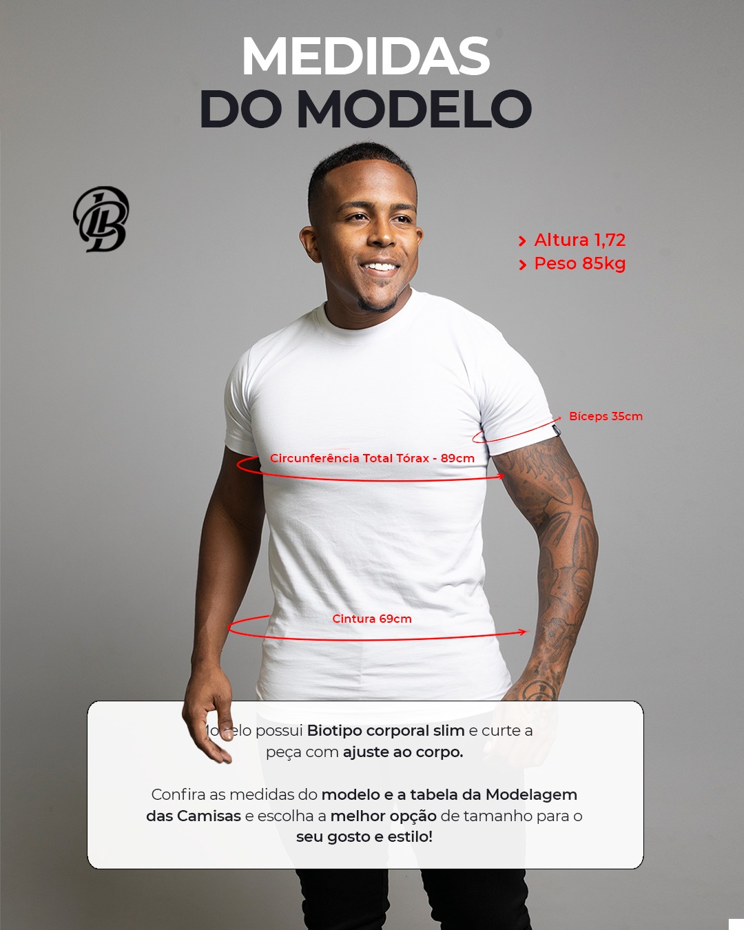Nosso modelo veste Tamanho P de camisa, possui 1,72 de altura, segue abaixo as medidas pessoais do modelo para você se basear:
