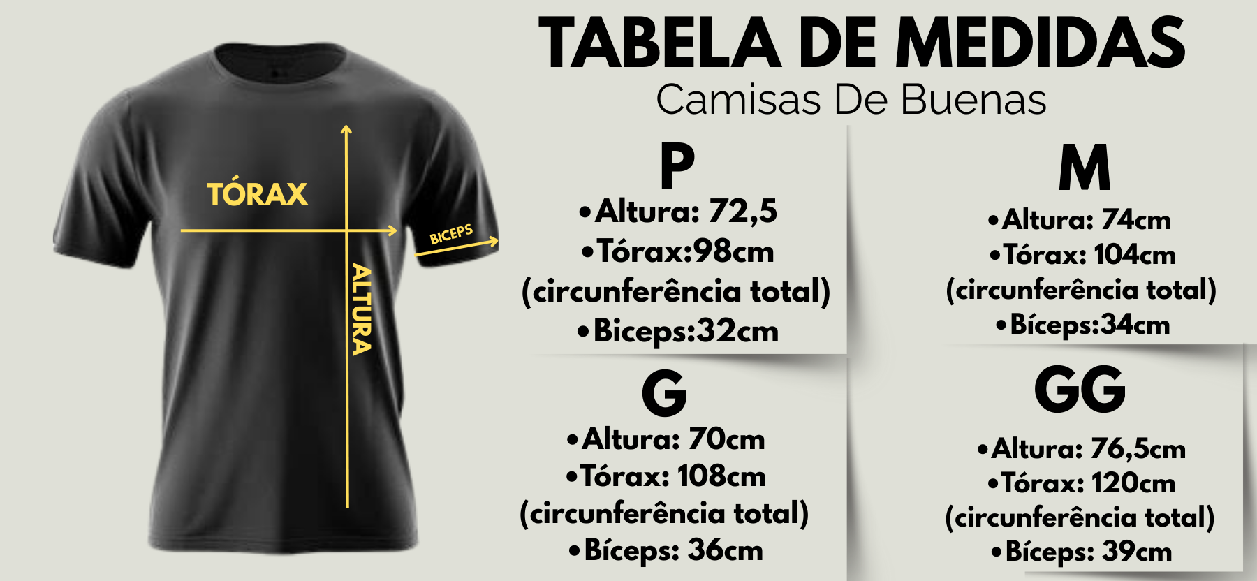 Tabela de medidas da Modelagem da Camisa abaixo, confira o melhor tamanho para o seu corpo: